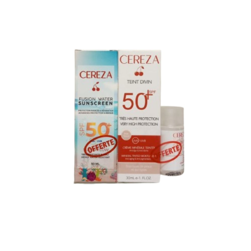 Le CEREZA Pack Beige Natural SPF50 associe protection solaire et soin teinté pour un teint uniforme tout en protégeant efficacement la peau contre les rayons UVA et UVB. Ce coffret inclut également un Fusion Water SPF50 offert, idéal pour compléter votre routine solaire quotidienne.
