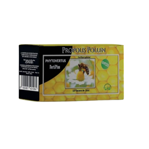 PHYTOVERTUS Propolis Pollen est un complément alimentaire sous forme d’ampoules buvables, associant deux trésors naturels de la ruche : la propolis et le pollen. Cette synergie contribue à renforcer l’organisme, soutenir les défenses naturelles et améliorer la vitalité générale, notamment en période de fatigue ou de changements de saison.