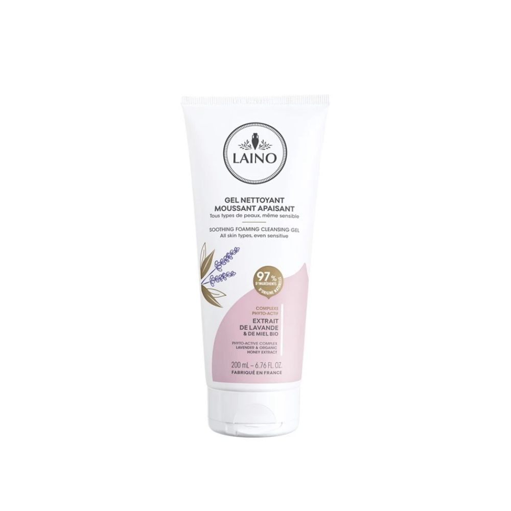 Le Gel Nettoyant Moussant Apaisant Laino est formulé à 97% d’ingrédients d’origine naturelle pour offrir un nettoyage doux et efficace des peaux sensibles. Il élimine maquillage, impuretés et excès de sébum tout en hydratant et revitalisant la peau. L’extrait de miel de lavande bio apporte confort et énergie régénérante, tandis que l’extrait de lavande, riche en antioxydants, stimule la régénération cutanée et améliore l’éclat. Sa texture miel-en-huile et son parfum sensoriel offrent un rituel agréable et apaisant.